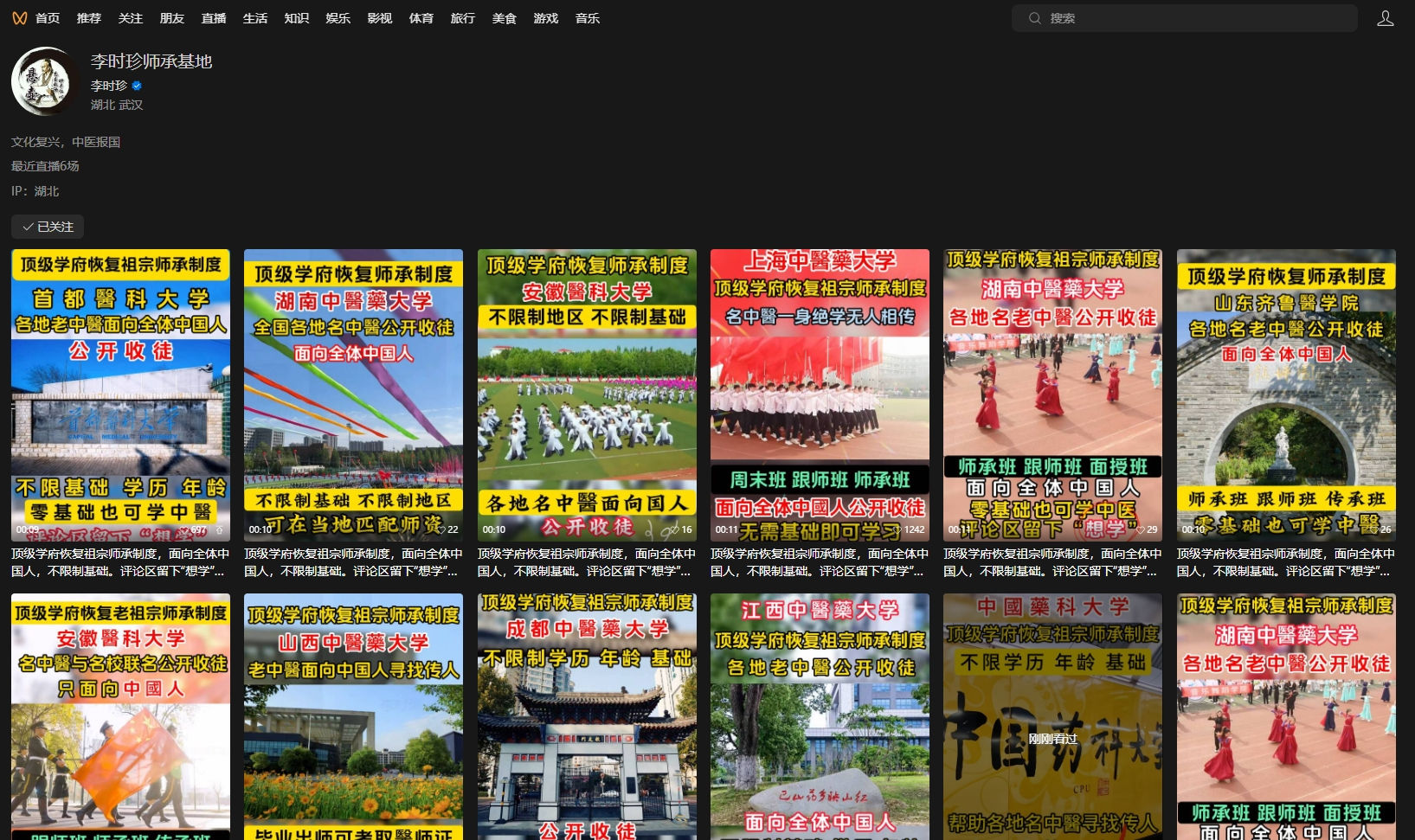 6月5日上午ღ◈◈,大象新闻接到网友求助ღ◈◈,称在一个名叫“李时珍师承基地”的视频号上ღ◈◈,看到河南中医药大学ღ◈◈、中国药科大学等全国知名的中医药大学轮番亮相ღ◈◈,所用的视频上均配有相应学校的门头ღ◈◈、教学楼等标志性建筑物ღ◈◈。